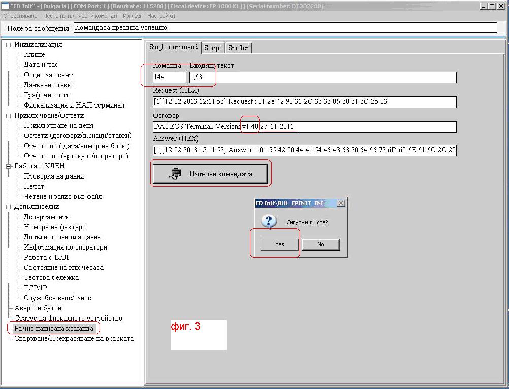 2. Проверяваме версията на терминала. Това става от FDinit NAP Configurator. (фиг.3). с команда 144 и параметър 1,63 – връща версия на фирмуер. И команда 144 и параметър 1,54 връща последни две числа на фирмуера. (фиг.4) Ако версията е по стара от юли 2011 задължително се записваме фирмуер (CorrIntTer.hex) и след това (IntTer_BUL_220312_v1.40.28.hex). Първия е корекционен файл, а втория е до версия 1.40.28